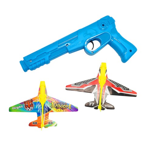 "Іграшка підвищує рухову активність дитини і підходить для ігор на свіжому повітрі в теплу пору року. Літаки заправляються в обойму і запускають, необхідно тільки відтягнути затвор і натиснути на спусковий гачок. Батарейки не потрібні. Працює за принципом арбалета. Ця іграшка точно не дасть Вам нудьгувати Прекрасний подарунок, як для хлопчиків, так і для дівчаток, а може і для самих батьків.У комплекті:ПістолетЛітак 2 шт
