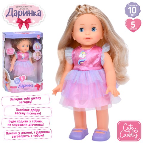 Лялька Даринка, 32 см, музичний звук (українською), 10 фраз, пісня, ходить, реагує на хлопок, на батарейках - Пориньте у веселі ігри з інтерактивною лялькою Даринка (32 см)! Вона говорить 10 фраз українською, співає, ходить і реагує на хлопки, розвиваючи уяву та координацію. Безпечна, на батарейках. Замовляйте на Demsky.com.ua!