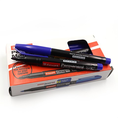 Маркер перманентний Luxor 100, 1-2 мм, синій, 12 шт. в упаковці - Пиши яскраво з перманентним маркером Luxor 100 (1-2 мм, синій, 12 шт.)! Спиртова основа гарантує стійкість до стирання, а круглий наконечник забезпечує точність. Підходить для паперу, пластику чи металу. Замовляйте на Demsky.com.ua для чіткого маркування!