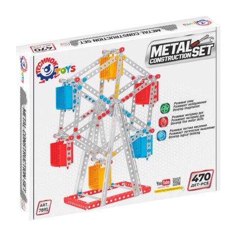 Традиція металевих конструкторів бере свій початок у далекому 18 ст. На цих конструкторах зросла безліч поколінь відомих винахідників, механіків та інженерів. Завдяки іграшці хлопчики (і дівчатка) набувають перших навичок з'єднання деталей гвинтами, гайками, роботи викруткою та ключами. Вони власноруч створюють справжні "працюючі моделі": різноманітні автомобілі, вертоліт, кран, трактор, поїзд, позашляховик, танк, мотоцикл та багато іншої техніки.Робота з конструктором: викликає у дітей інтерес до роботи машин та механізмів; дає базові поняття про взаємодію окремих елементів; знайомить з технічними назвами деталей, простими кресленнями та схемами; розвиває навикилогічне мислення, просторову уяву, уважність та фантазію.Металеві конструктори ТехноК відрізняються високою якістю та різноманітністю деталей, цікавим поєднанням металевих та пластикових запчастин. У кожному наборі є викрутки та ключі для складання моделей.Конструктор металевий арт. 7891 "Колесо огляду" (470 деталей) серії "Пам'ятки - модель одного з найбільших оглядових коліс London Eye м. Лондон, Великобританія. Висота зібраної моделі - 30 см.Особливістю набору є пластикові кліпси для фіксації металевих пластин. Вони забезпечують швидкий та легкий збір конструктора. Крім функціоналу, яскравий колір надає краси зібраним моделям.У наборах покрокова кольорова інструкція.Упаковка – яскрава коробка.Для дітей віком від 5 років.