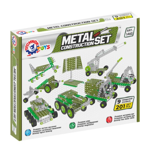 "Військова техніка ТехноК" (201 деталь) - металевий конструктор із тематичною військовою комплектацією. Перевага іграшки - металеві деталі різних кольорів та цікаві різноколірні пластикові деталі.