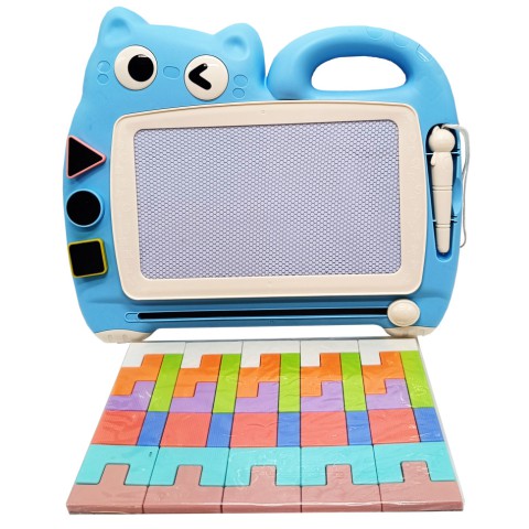 Магнітна дошка для малювання. Малювати за допомогою ручки-стікера і штампиків-печаток 3-х видів + тетріс. Під час переміщення важеля праворуч внизу дощечки, малюнок зникає. Дошка має зручну ручку для перенесення. Дошка укомплектована двома штампиками та ручкою-стікером.