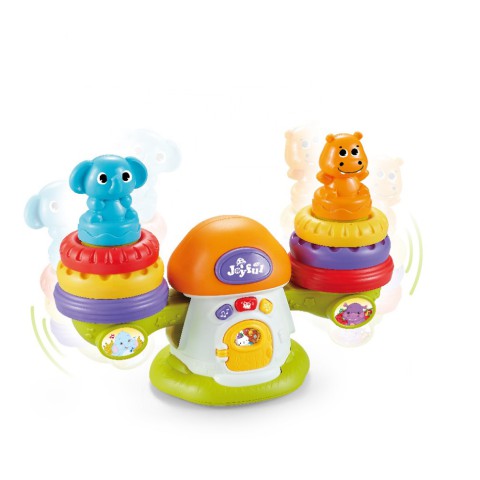Чудова іграшка для розвитку дитини, виконана в яскравому забарвленні і милому дизайні, який оцінить кожен малюк.У комплект входять грибок-будиночок, фігурки тварин і різнокольорові кільця.На чаші терезів нанизуються фігурки слоника і бегемотика і різнокольорові кільця, чаші схиляються в ту або іншу сторону в залежності від кількості одягнутих предметів, треба домогтися рівноваги ваг.Якщо грибок включити, він програє мелодію, велика кнопка на капелюшку грибочки подсветится. Якщо перекладину гойдалок качнути, велика кнопка на капелюшку грибочки подсветится, грибочок буде видавати різноманітні звуки. Регулятор гучності - кнопка включення і виключення.На лицьовій стороні іграшки є кнопки, які дозволяють більше одного режиму роботи:- програє мелодії, кнопка на капелюшку грибочки в цей момент підсвічується. Повторне натискання кнопки із зображенням ноти - перемикання мелодії (всього 6 мелодій);- режим виконання барабанних партій, кнопка на капелюшку грибочка в момент виконання партій підсвічується. Повторне натискання кнопки із зображенням барабана - перемикання мелодії (всього 6 мелодій);- виконує колискові, кнопка на капелюшку грибочки в цей момент підсвічується. Повторне натискання кнопки із зображенням підвіски - перемикання мелодії (всього 8 мелодій).Якщо не робити ніяких маніпуляцій з іграшкою протягом 90 секунд, вона вимкнеться.Іграшка відмінно розвиває дрібну моторику рук, координацію рухів, слухове і зорове сприйняття, логічне мислення.Живлення іграшки: 2 Батарейки типу АА (В комплект не входить)Розмір упаковки: 22х11,4х30 см.