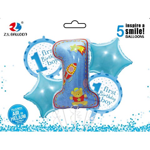 Набір фольгованих куль First Birthday-Boy, 5 шт. (1 шт. 80 см + 4 шт. 45 см)