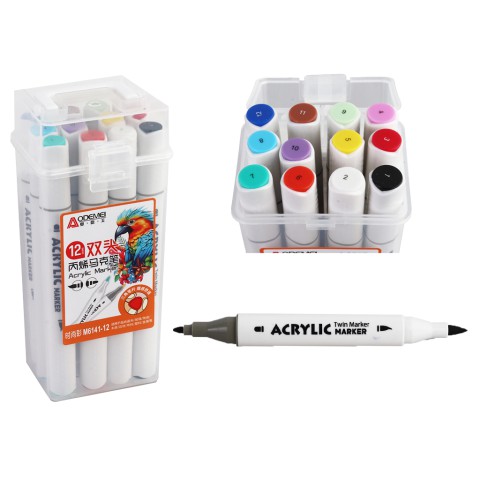 Набір акрилових скетчмаркерів двосторонніх Aodemei, трикутний корпус, м’який+твердий, 12 шт., пластиковий бокс