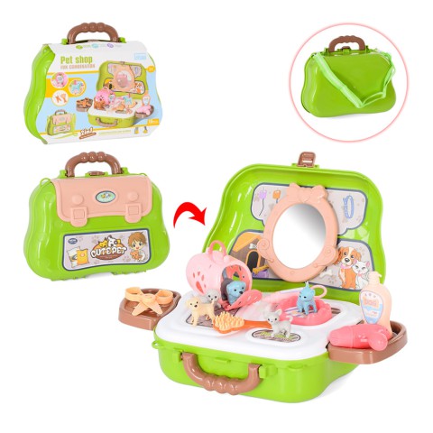 Ігровий набір включає предмети салону краси для тварин.З його допомогою дівчинка зможе подбати про красу своїх вихованців. Всі предмети розташовані у зручній валізці з ручкою та ремінцем, що дозволить брати набір із собою на прогулянку або в гості. Набір аксесуарів буде чудовим подарунком маленькій модниці. Розмір упаковки: 25х17х9см. Комплектація: фен, гребінець, імітація косметики, фігурки тварин.