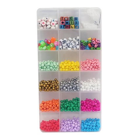 Набір призначений для дітей, які люблять творчо проводити час і створювати унікальні аксесуари. До комплекту входить:- **Бусини з буквами (англійські)**: набір різноманітних яскравих намистин, виконаних у вигляді англійських літер, що дають змогу створювати персоналізовані браслети з іменами або відмітними написами. - Волосінь**: міцна і легка у використанні нитка, стійка до розривів, що забезпечує надійну фіксацію намистин і довговічність готових виробів.- **Зручний пенал**: компактний пенал для зберігання всіх компонентів набору, який зручно носити з собою і зберігати порядок у матеріалах.З цим набором кожна дитина зможе розвинути свої творчі здібності, створити оригінальні браслети і подарувати їх своїм друзям або родичам. Чудовий подарунок для маленьких модниць і любителів рукоділля!