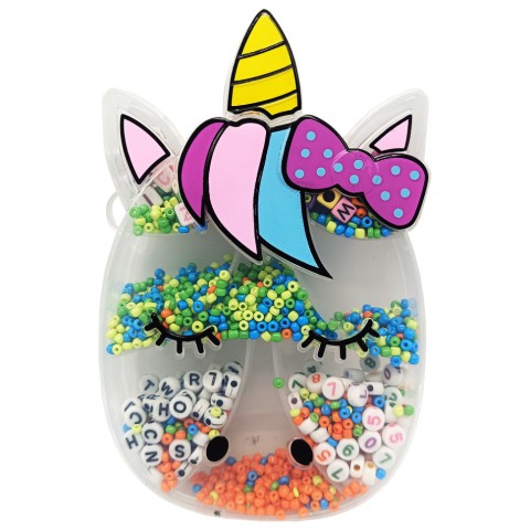 Набір великих різнокольорових намистин в оригінальній прозорій коробочці у вигляді єдинорога. У наборі 8 різних видів намистин. У наборі також є волосінь. Дитина зможе створити свій власний браслет, намисто або сережки. Розвиває творче мислення, дрібну моторику рук і фантазію.