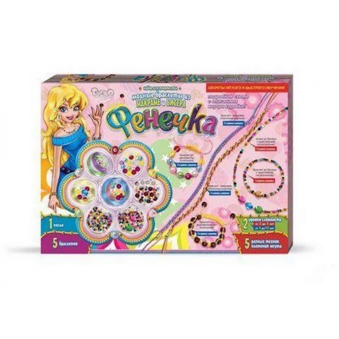 Набір для творчості "Фенечка". Виготовлення 1 кольє і 5 браслетів з бісеру і макраме різної складності. Комплектація: різнобарвна нитка "джгут", еластична нитка, різнокольорові намистини, полімерні кристали, різнокольоровий бісер, металевий замок - карабін, дерев'яні намистини, детальна покрокова інструкція.