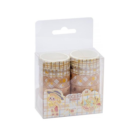 Набір декоративного скотчу містить 10 бобін різної ширини: 4 бобіни по 1 см, 4 бобіни по 1,5 см та 2 бобіни по 2 см. Довжина кожної бобіни складає 2 метри. Використовується для оформлення фотографій, декору книг, кімнатного дизайну та упаковки подарунків.