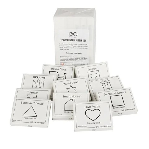Набір міні-головоломок Заморочка 12 Wooden mini puzzle set із завданнями на англійській мові. До набору увійшли найпопулярніші плоскі головоломки, завданням яких є скласти фігурку, зображену на упаковці. Такі собі пазли-головоломки :-)
