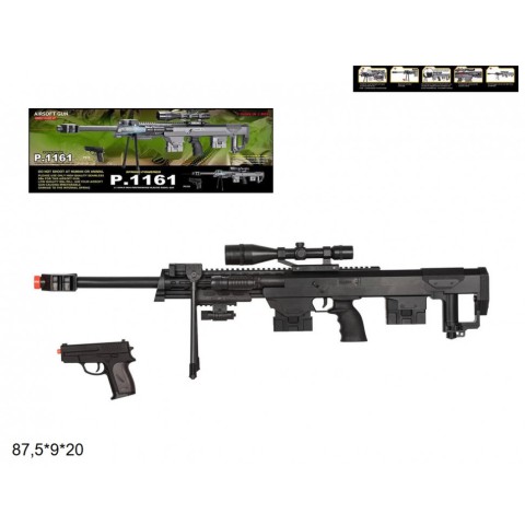 Комплект Р.1161 Автомат з пістолетом 2 в 1 Автомат і пістолет стріляють пластмасовими кульками BB 6мм, на автоматі є імітація оптичного прицілу, лазерний приціл, ліхтарик, сошки для упору при стрільбі, запасний магазин.Розмір автомата 82см.Комплектація:автомат;пістолет;лазер;ліхтарик;приціл;сошки;магазин 2шт;пульки. Розміри упаковки 88,5х20,7х9,7смПеред використанням проводите з дітьми ретельний інструктаж щодо небезбпеки травми себе і оточуючих.