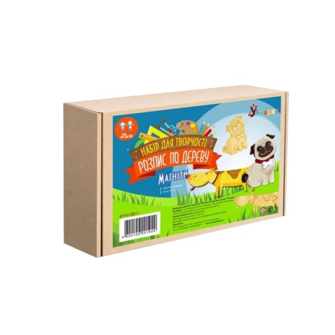 Опис Набір для творчості «Розпис по дереву »Магніти-собачки»Розмір коробки ДхШхВ см 16,5х4,2х11,4. Розмір готових виробів 9,5 і 6 см.У наборі: 2 основи для розпису з фанери з нанесеними контурами, набір акрилових фарб із 6 кольорів, пензлик, магніт.Для дітей від 6 років і старше.
