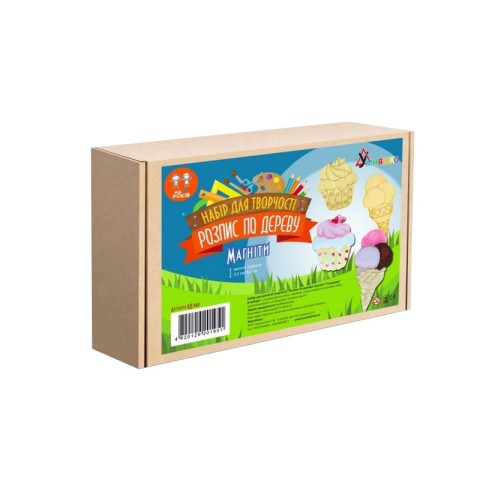 Опис Набір для творчості «Розпис по дереву »Магніти-солодощі»Розмір коробки ДхШхВ см 16,5х4,2х11,4. Розмір готових виробів 5,5 і 8,5 см.У наборі: 2 основи для розпису з фанери з нанесеними контурами, набір акрилових фарб із 6 кольорів, пензлик, магніт.Для дітей від 6 років і старше.