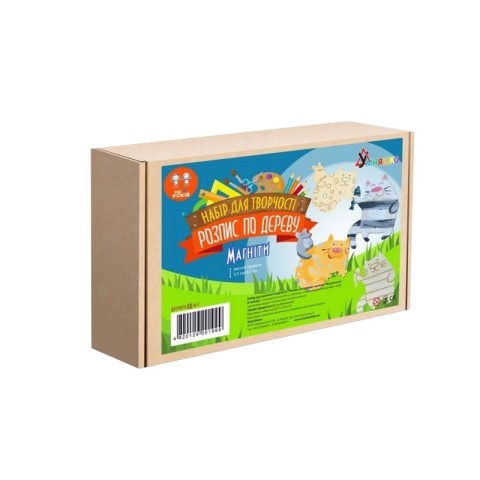 Опис Набір для творчості «Розпис по дереву »Магніти-веселі коти»Розмір коробки ДхШхВ см 16,5х4,2х11,4. Розмір готових виробів 5 і 6 см.У наборі: 2 основи для розпису з фанери з нанесеними контурами, набір акрилових фарб із 6 кольорів, пензлик, магніт.Для дітей від 6 років і старше.