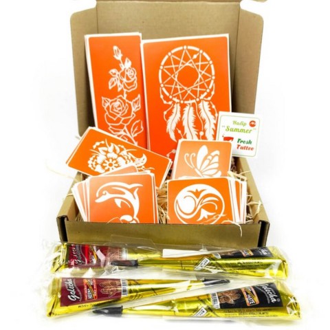 Набір для біо-тату;Літо 2.0 - хна; містить:хну в конусі чорну та коричневу по 2 штуки;32 трафарети 6*6 см;8 трафаретів 6*10 см;3 трафарети 6*15 см;3 трафарети 10*15 смВага хни у кожному конусі: 25 г.Чому саме хна в конусі ТМ Golecha;єдина сертифікована хна;схвалено МОЗ України;малюнок залишається на шкірі до 7 днів;вимивається рівномірно.Застосування хни для біо-тату: Зробити тест на алергію! нанести на тіло товстим шаром (для зручності можна використовувати трафарет); через 20 хвилин|мінути| видалити суху хну.Кокосова олія з евкаліптом для закріплення тату хною.Після зняття хни необхідно нанести олію для закріплення малюнка та яскравості кольору.Тільки для зовнішнього застосування!Як зробити біо-тату хною: виберіть рівномірну ділянку шкіри; добре знежирте його; зніміть із трафарету білу підкладку (паперова основа трафарету); приклейте трафарет на суху та знежирену шкіру; обережно зніміть прозору плівку і переконайтеся, що трафарет (помаранчева частина) щільно приклеєний до шкіри; Нанести через трафарет на тіло хну товстим шаром; через 20 хвилин|мінути| видалити суху хну.Для чого потрібний трафарет: якщо не вмієте малювати від руки; якщо потрібно багато та швидко малювати; потрібно створювати однакові і за розміром, і на вигляд малюнки - скористайтеся трафаретами Fresh Tattoo; трафарети Fresh Tattoo безпечні для шкіри і підходять для нанесення тимчасових тату всіх типів: гліттер-тату, хною, оксамитом, пігментом, джагуа-гелем і так далі; підходять для хімічного або піскоструминного матування виробів зі скла (чашки, келихи, дзеркала);