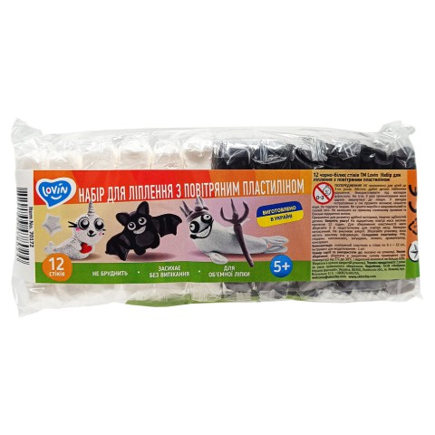 У набір входить 12 стіків - 6 білого та 6 чорного кольору.Це базові кольори, які стануть у пригоді, коли в тебе достатньо різнокольорових стіків повітряного пластиліну та для втілення ідеї не вистачає саме їх, класичних чорного та білого.Тепер цю проблему легко вирішити!