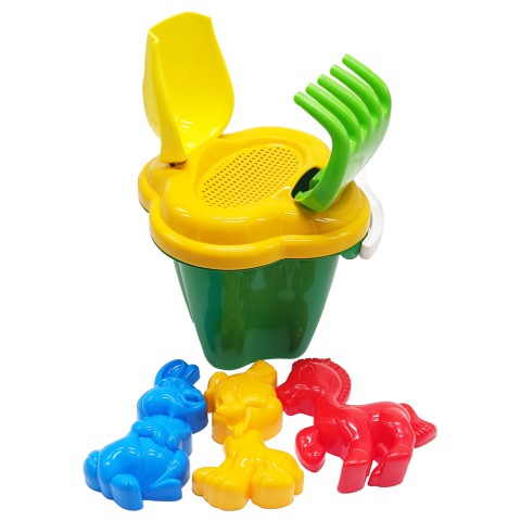 У комплекті: відерце, сито, лопатка, грабельки і три пасочки.