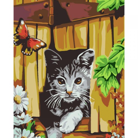 Набір для розпису по номерах Котик та метелик біля паркану, Strateg, 30x40 см, SS-6451
