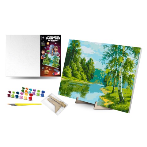 Картина за номерами Qbee "Березовий край" 40×50 см з підставкою – спокійний пейзаж для релаксу під час свят! Фарби, пензлі, номери полегшують процес.