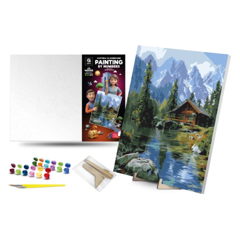 Картина за номерами Qbee Гірська ріка з дерев’яною підставкою 40×50 см QB900-084 – спокійний пейзаж гірської ріки, готовая картина на підставці для настільного декору.