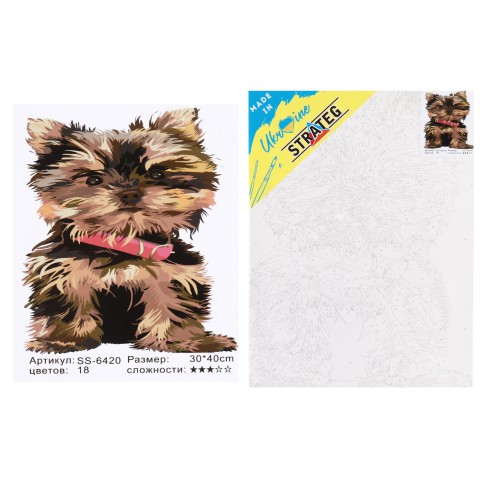 Набір для розпису по номерах Серйозний собака, Strateg, 30x40 см, SS-6420 пропонує створення картини із зображенням собаки завдяки полотну 30x40 см. Включає акрилові фарби, пензлики та інструкцію. Міцне полотно на підрамнику забезпечує зручність. Ідеально для творчості. Створюйте милі шедеври! Купуйте на Demsky.com.ua.