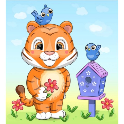 Набір для розпису по номерах Тигриня з пташками, Strateg, 30x30 см, ES204 пропонує створення картини із зображенням тигреняти з птахами завдяки полотну 30x30 см. Включає акрилові фарби, пензлики та інструкцію. Міцне полотно забезпечує зручність. Ідеально для творчості. Створюйте милі шедеври! Купуйте на Demsky.com.ua.