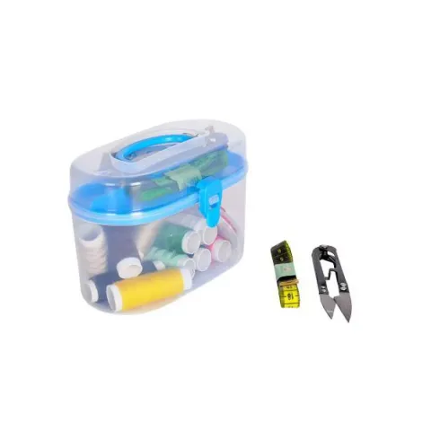 Набір для шиття у компактному контейнері. В наборі: нитки - 10 кольорів, 4 гудзики, 1 набір голок, 1 наперсток, 2 Нитковтягувача, 1 ножиці, 1 сантиметр, 10 шпильок. Розмір упаковки: 15х9х7 см.