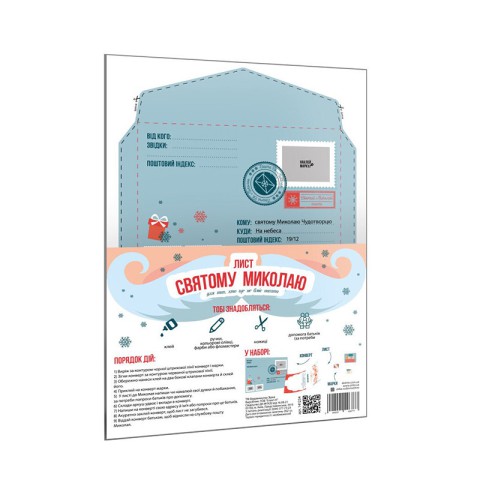 У наборі: лист, конверт і святкові марки. Усе необхідне, щоб надіслати свій чарівний лист до Святого Миколая.