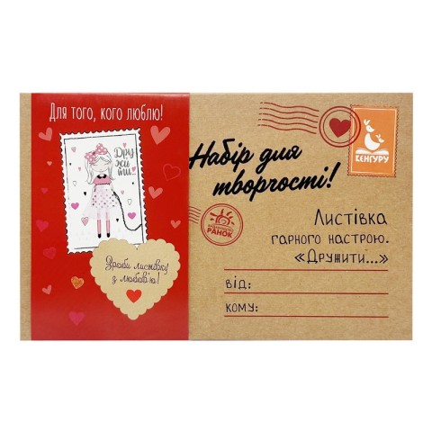 У наборі зібрані матеріали для декору, з якими листівка набуває індивідуальність. Дитина може прикрасити її на свій смак і дописати адресне привітання, вкладаючи теплі слова та емоції.