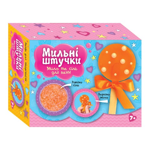 "Мильні штучки. Мило та сіль для ванн" - це творчий подарунок для дітей на будь-які свята, який 100% зацікавить кожного малюка!Створення 2 косметичних засоби із натуральних складових!Вивчення нових технік миловаріння та розкриття секретів приготування ароматної солі для ванн!Процес приготування мила та солі неймовірно захоплюючий. Відкриваємо набір і розпочинаємо магію. Усе необхідне для роботи міститься у наборі. Відкривай та твори! В результаті отримуємо гарнесеньке помаранчеве мило-цукерочку і кольорову морську сіль для ванни з приємним ароматом.Набір містить: мильну основу, морську сіль, формочку-стаканчик, дерев'яну паличку, барвник, масло-основу з ефірною олією, намистинки, одноразові рукавички, інструкцію.