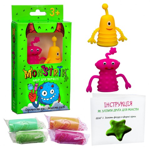 З набором для творчості «Monstrik» дитина зможе зліпити з маси одного для монстриков, які вже є в наборі, а потім влаштує справжній монстротеатр. Для цього досить надягти фігурки монстриков на пальчики і грати. Розігруйте з дітками сценки, тим самим розвиваючи їх фантазію і комунікативні навички.вік 3+Комплектація: 2 монстрика, маса для ліплення, інструкція.