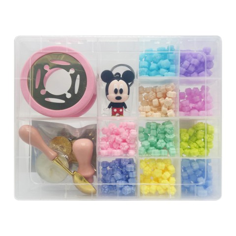 Усі елементи зручно розміщені у міцному пластиковому боксі, що забезпечує порядок, легке зберігання та комфортне транспортування. У комплект входить усе необхідне для роботи: парафінова свічка для нагрівання, ложечка для плавлення воску, підставка для нагрівання та металева печать з витонченими змінними насадками, які дозволяють створювати різні варіанти відбитків.