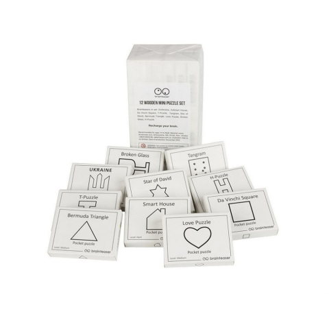 Зручний формат для того, щоб завжди мати під рукою джерело розумних розваг, наприклад, у дорозі кишенькові головоломки допоможуть приємно та з користю провести час. Міні головоломки Заморочка виконані з приємного на дотик дерева, варіюються за рівнем складності. До набору входить: Квадрат Леонардо, Троєчник, Будиночок, Тризуб, Сім п'ятниць, Індійський трюк, Ключ Архімеда, Симетрія, Осколки Келиха, Тарзан і кокоси, Автопазл, Зірка Давида.