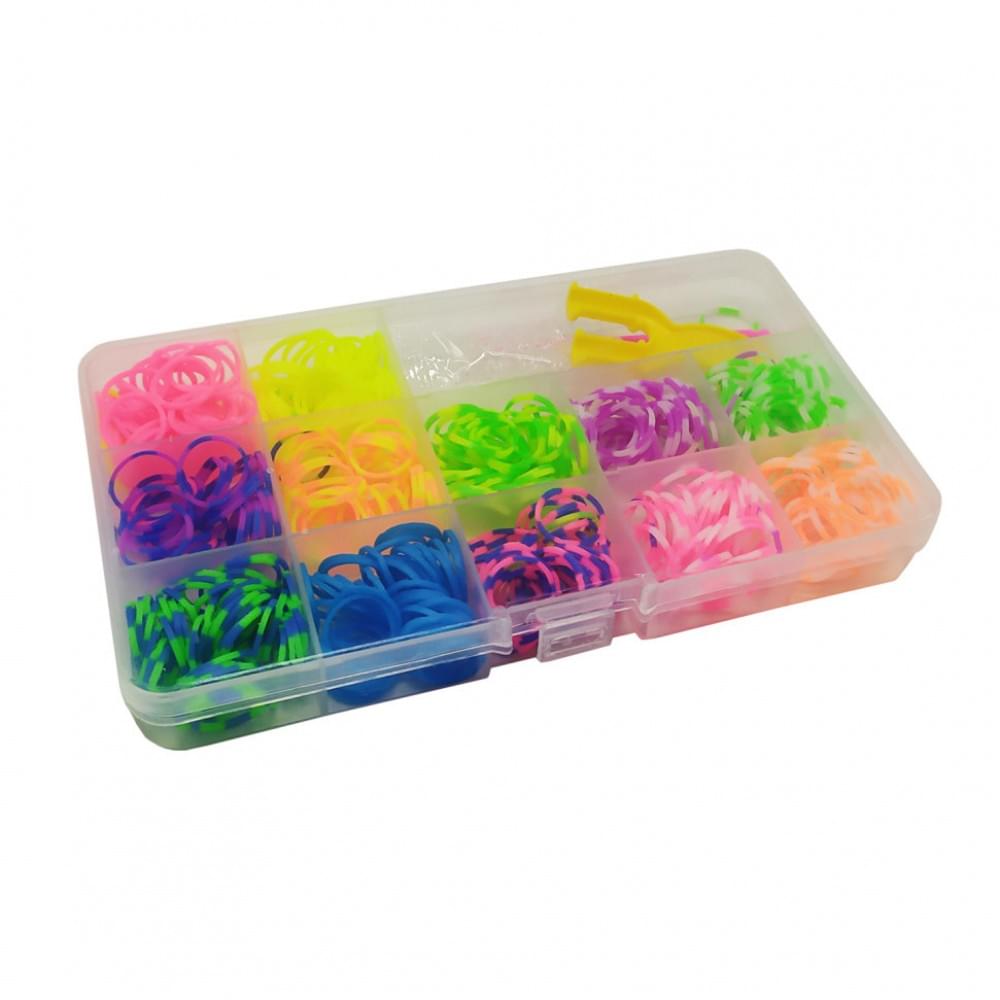 У наборі 600 гумок, кліпси, гачок для плетіння, верстат-рогатка.