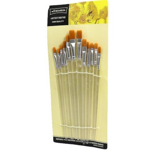Універсальний набір плоских пензлів із синтетичного волокна (нейлону), який стане незамінним інструментом як для професійних художників, так і для початківців чи учнів художніх шкіл. Плоска форма пучка ідеально підходить для нанесення широких рівномірних мазків, зафарбовування фону та створення чітких контурів.