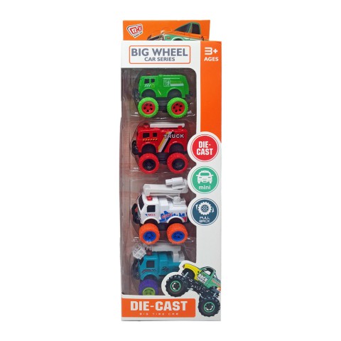 Набір веселих машинок-всюдиходів, у кожного з яких є своя важлива місія та яскраве забарвлення.Кожна машинка з набору має металевий кузов та пластикове шасі, а також пластикові рухомі елементи - крани або гачки.Та окрім металевого корпусу та прогумованих коліс, у цих машинок є інерційний механізм, за допомогою якого можна влаштовувати перегони, поки не закінчиться інерційний заряд.У наборі 4 машинкиРозмір машинки - 4*4*4 см