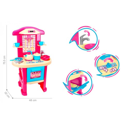 Правильно підібрані іграшки допомагають дітям краще пізнавати світ, пізнавати щось нове і розвивати таланти. Важливо, щоб іграшки були зрозумілими і створеними на основі знайомих дитині речей. Посуд та кухонне приладдя - це перші предмети побуту, з якими знайомиться дитина, адже зустрічає їх щодня. Саме тому кухні і іграшкова посуд такі цікаві для всіх дітей.Іграшкова "Кухня ТехноК" дозволить дітям відчути себе справжніми шефами. На кухні є дві конфорки з ручками, які обертаються і імітують включення газу, гачки, полички для посуду і велика духовка. В наборі також є різноманітний посуд для приготування корисних страв та сервірування святкового столу. Після смачної вечері треба помити посуд - для цього є мийка із краном.Висота кухні в зібраному вигляді 75,5 см, а ширина стільниці 48 см. У широкої стільниці зручно грати двом, а то й трьом дітям.Іграшкова "Кухня" від ТехноК - відмінний вибір для сюжетно-рольових ігор. Вони добре розвивають координацію, фантазію, комунікативні здібності та мислення дітей, допомагають сформувати навички приготування їжі, прибирання, вивчити правила поведінки з технікою на кухні.Іграшка виготовлена з нетоксичного міцного пластику без запаху. Використання тільки високоякісних барвників забезпечує яскравий колір протягом тривалого терміну використання.В комплект посуду входить: сковорода, чайник, каструля з кришкою, 2 глибокі тарілки, 2 чашки, столові й кухонні прилади.Упаковка - яскрава коробка з ручкою (58 х 48 х 15,5 см).