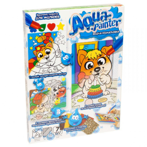 Оригінальний дитячий набір креативної творчості AQP-01 "Aqua Painter" Danko Toys - це чудовий подарунок, який ідеально підходить як для дівчинки, так і для хлопчика старше чотирьох років. Барвисто оформлений, виконаний в кращих традиціях бездоганної, перевіреної якості Danko Toys комплект викличе бурю позитивних емоцій у Вашого непосиди. У яскравій, стильній упаковці розміром 20 х 2,5 х 27 см для своїх творчих звершень крихітка знайде магічний пензлик, велику кількість кольорових наклеєчок, чотири картинки різного розміру для розфарбовування, а також докладну інструкцію для початківців. З таким набором для творчості навіть новачок зможе відчути себе справжнім Пікассо, адже для малювання навіть не будуть потрібні фарби. Секретні картинки моментально «оживають» при зіткненні з вологим пензликом, що не залишить байдужими навіть самих примхливих малюків. Щоб намочити пензлик, не будуть потрібні спеціальні ємності з водою, тому що вона заправляється рідиною і малює простим натисканням на поверхню. Готовий виріб можна декорувати блискучою мозаїкою.