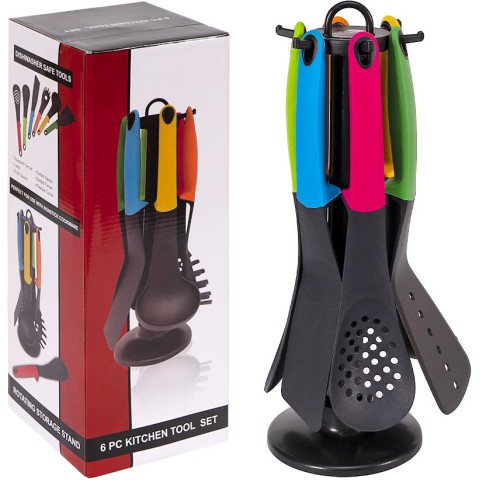 Набір кухонного приладдя, 6 шт. Матеріал - нейлон для посуду з антипригарним покриттям. Термостійкість до 210 ° С. Не дряпає посуд. Ідеальний для посуду з антипригарним покриттям. Уникайте контакту з вогнем. Не залишайте прилади в посуді. Придатний для миття в посудомийній машині. Комплектація: підставка, ополоник, 2 лопатки, сервірувальна ложка, ложка для спагетті, шумівка. Розмір: 29 см.