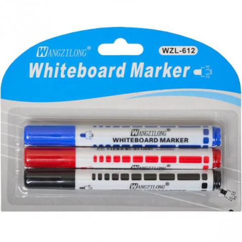Набір маркерів на водній основі для дошки. В упаковці 3 штуки: чорний, червоний, синій. Ширина лінії 1,5 - 3 мм.