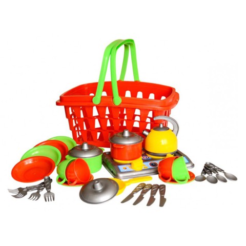 ІНабір яскравого пластикового посуду. У комплекті: плита на 2 конфорки (22 х 16 см), 8 тарілочок, 4 чашечки, сковорідка з кришкою, каструлька з кришкою, чайник з кришечкою, 4 ложечки, 4 вилочки і 4 ножі. Як упаковка - пластиковий кошик зі зручними ручками.