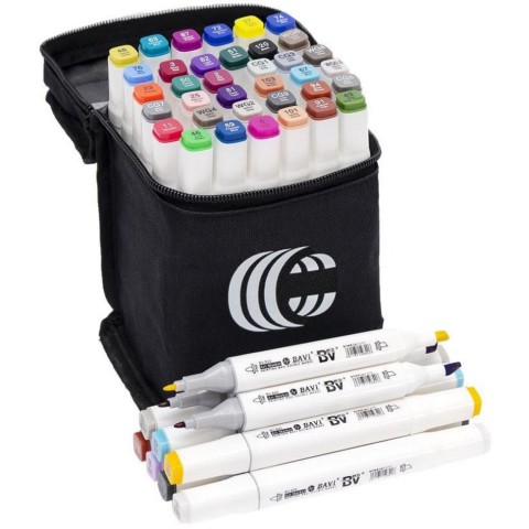 Набір двосторонніх фломастерів / скетч маркерів на спиртовій основі. У наборі 36 штуки в сумці. З одного боку звичайний фломастер, з іншого боку скошений маркер. Кожен колір має свій цифровий код, який нанесений на ковпачок маркера. Ковпачки щільно закривають маркер, перешкоджаючи висиханню. Чорнило на спиртовій основі добре вбирається в папір, тому рекомендується використовувати щільні аркуші або картон. Розмір боксу см 10х12х20