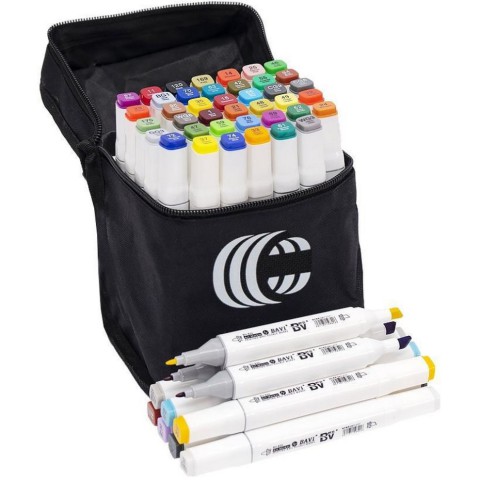 Набір двосторонніх фломастерів / скетч маркерів на спиртовій основі. У наборі 40 штуки в сумці. З одного боку звичайний фломастер, з іншого боку скошений маркер. Кожен колір має свій цифровий код, який нанесений на ковпачок маркера. Ковпачки щільно закривають маркер, перешкоджаючи висиханню. Чорнило на спиртовій основі добре вбирається в папір, тому рекомендується використовувати щільні аркуші або картон. Розмір сумки 10х11х15 см