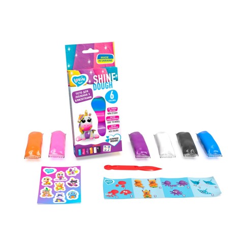 Набір для ліплення "Shine Assorted" TM Lovin. У комплекті 6 різних кольорів тіста з блискітками по 35 гр кожен (помаранчевий,рожевий, фіолетовий, білий,чорний і синій), скатель, наліпки та інструкція.Дитині буде приємно та цікаво з ним гратися тому що цей пластилін дуже м'який на дотик, а також ігри з пластиліном та ліплення з нього розвивають дрібну моторику. Приємним бонусом є те, що цей пластилін не липне до поверхні і його дуже легко прибрати.