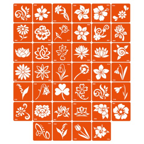 Колекція простих трафаретів квітів, 40 штуки в розмірі 6 на 6 см.Як зробити біо-тату: виберіть рівномірну ділянку шкіри; добре знежирте її; зніміть із трафарету білу підкладку (паперова основа трафарету); приклейте трафарет на суху і знежирену шкіру; акуратно зніміть прозору плівку і переконайтеся, що трафарет (помаранчева частина) щільно приклеєний до шкіри; нанесіть рівномірний шар клею для боді-дизайну і дайте йому просохнути (від 30 секунд до 2 хвилин залежно від шару клею); нанесіть гліттер (блискітки) на клей і щільно вбийте його пензлем для гліттера; змахніть надлишки гліттера пензлем-зміткою і зніміть трафарет.Для чого потрібен трафарет: якщо не вмієте малювати від руки; якщо потрібно багато і швидко малювати; потрібно створювати однакові і за розміром, і за зовнішнім виглядом малюнки - скористайтеся трафаретами Fresh Tattoo; трафарети Fresh Tattoo безпечні для шкіри та підходять для нанесення тимчасових тату всіх типів: гліттер-тату, хною, оксамитом, пігментом, джагуа-гелем тощо; підходять для хімічного або піскоструминного матування виробів зі скла (чашки, келихи, дзеркала)