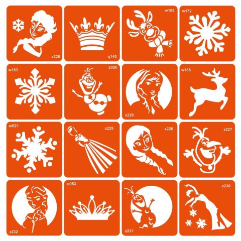 Колекція трафаретів з мультфільму Холодне серце, 16 штук у розмірі 6 на 6 см.Як зробити біо-тату: виберіть рівномірну ділянку шкіри; добре знежирте його; зніміть із трафарету білу підкладку (паперова основа трафарету); приклейте трафарет на суху та знежирену шкіру; обережно зніміть прозору плівку і переконайтеся, що трафарет (помаранчева частина) щільно приклеєний до шкіри; нанесіть рівномірний шар клею для боді-дизайну та дайте йому просохнути (від 30 секунд до 2 хвилин залежно від шару клею); нанесіть глітер (блискітки) на клей і щільно вбийте його пензлем для глітера; змахніть надлишки гліттера пензлем-кошторисом і зніміть трафарет.Для чого потрібний трафарет: якщо не вмієте малювати від руки; якщо потрібно багато та швидко малювати; потрібно створювати однакові і за розміром, і на вигляд малюнки - скористайтеся трафаретами Fresh Tattoo; трафарети Fresh Tattoo безпечні для шкіри і підходять для нанесення тимчасових тату всіх типів: гліттер-тату, хною, оксамитом, пігментом, джагуа-гелем і так далі; підходять для хімічного або піскоструминного матування виробів зі скла (чашки, келихи, дзеркала);