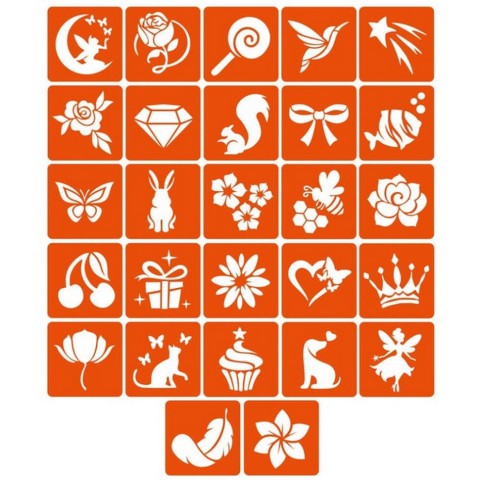 Колекція простих трафаретів «Легка краса», 27 трафаретів 5*5 см.Як зробити біо-тату:виберіть рівномірну ділянку шкіри;добре знежирте її;зніміть із трафарету білу підкладку (паперова основа трафарету);приклейте трафарет на суху і знежирену шкіру;акуратно зніміть прозору плівку і переконайтеся, що трафарет (помаранчева частина) щільно приклеєний до шкіри;нанесіть рівномірний шар клею для боді-дизайну і дайте йому просохнути (від 30 секунд до 2 хвилин залежно від шару клею);нанесіть гліттер (блискітки) на клей і щільно вбийте його пензлем для гліттера;змахніть надлишки гліттера пензлем-зміткою і зніміть трафарет.Для чого потрібен трафарет:якщо не вмієте малювати від руки;якщо потрібно багато і швидко малювати;потрібно створювати однакові і за розміром, і за зовнішнім виглядом малюнки - скористайтеся трафаретами Fresh Tattoo;трафарети Fresh Tattoo безпечні для шкіри та підходять для нанесення тимчасових тату всіх типів: гліттер-тату, хною, оксамитом, пігментом, джагуа-гелем тощо;підходять для хімічного або піскоструминного матування виробів зі скла (чашки, келихи, дзеркала);