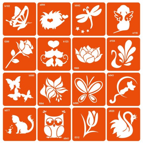 Колекція простих трафаретів для дівчаток, 16 штук у розмірі 6 на 6 см.Як зробити біо-тату: виберіть рівномірну ділянку шкіри; добре знежирте його; зніміть із трафарету білу підкладку (паперова основа трафарету); приклейте трафарет на суху та знежирену шкіру; акуратно зніміть прозору плівку і переконайтеся, що трафарет (помаранчева частина) щільно приклеєний до шкіри; нанесіть рівномірний шар клею для боді-дизайну та дайте йому просохнути (від 30 секунд до 2 хвилин залежно від шару клею); нанесіть глітер (блискітки) на клей і щільно вбийте його пензлем для глітера; змахніть надлишки гліттера пензлем-кошторисом і зніміть трафарет.Для чого потрібний трафарет: якщо не вмієте малювати від руки; якщо потрібно багато та швидко малювати; потрібно створювати однакові і за розміром, і на вигляд малюнки - скористайтеся трафаретами Fresh Tattoo. трафарети Fresh Tattoo безпечні для шкіри і підходять для нанесення тимчасових тату всіх типів: гліттер-тату, хною, оксамитом, пігментом, джагуа-гелем і так далі; підходять для хімічного або піскоструминного матування виробів зі скла (чашки, келихи, дзеркала);