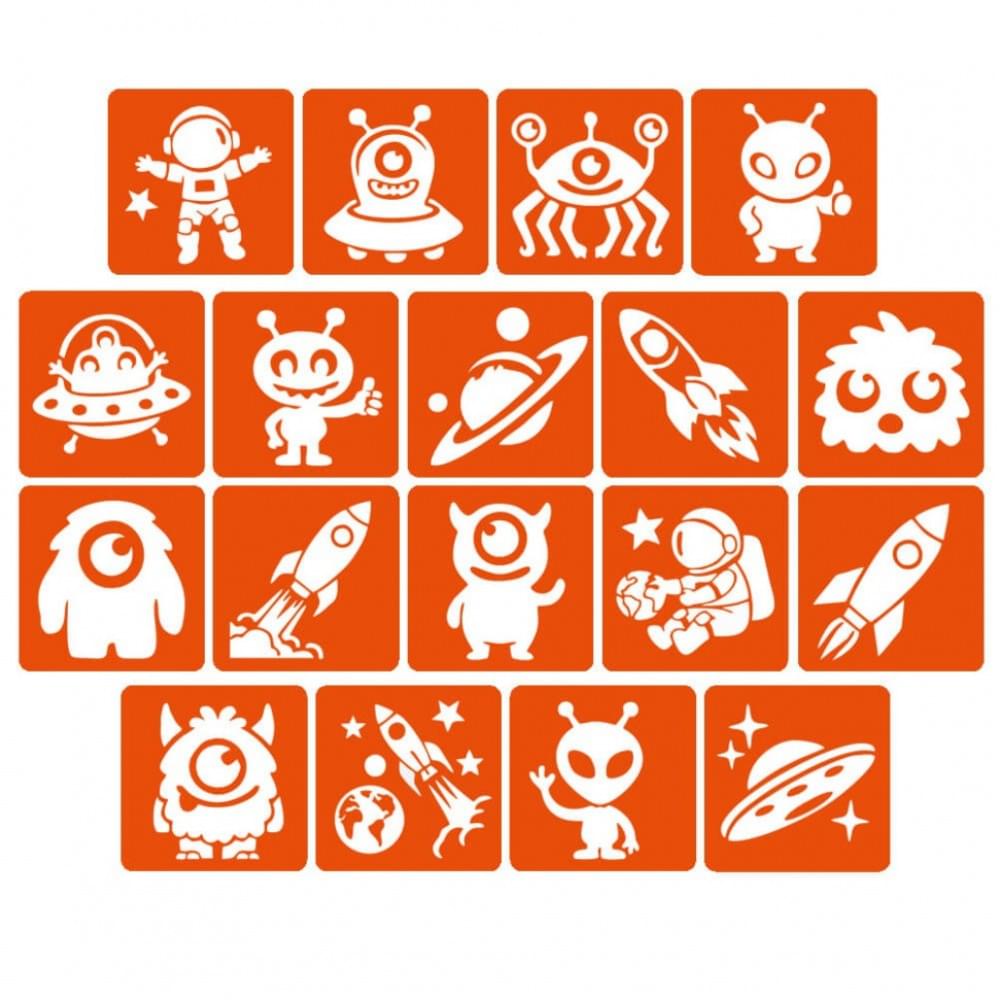 Набір трафаретів для створення біо-тату або гліттер-тату з веселими дизайнами на тему монстрів і ракет. Колекція підходить для дитячої творчості, тематичних свят, майстер-класів і домашніх занять.